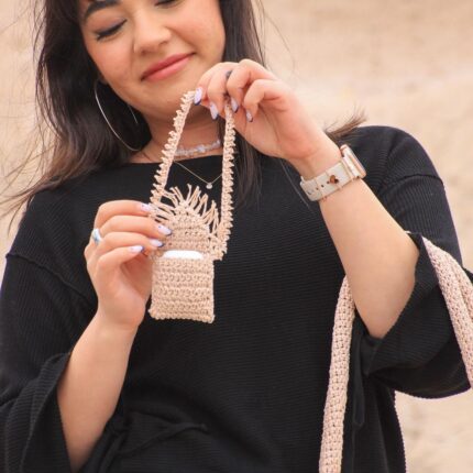 Uçuk pembe tonları pastel ve nötr renklerle mükemmel uyum sağlar. Bohem ve vintage tarz kombinlerinizi tamamlayacak ideal bir aksesuardır.