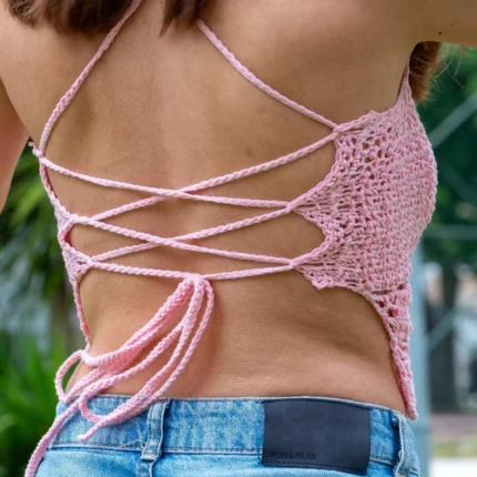 Gün batımı çizgili tek omuzlu crop top: el yapımı, %100 pamuk ve nefes alan doku. Festival, plaj ve şehir akşamları için hafif, konforlu ve çok yönlü.