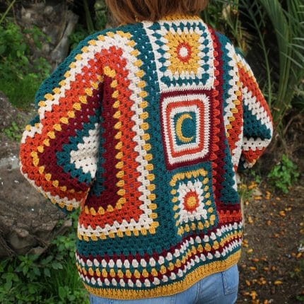 El yapımı üçgen desenli hırka, siyah beyaz mozaik tasarımıyla öne çıkar. Modern boho tarzı ve sürdürülebilir yapısıyla özgün bir görünüm sunar.