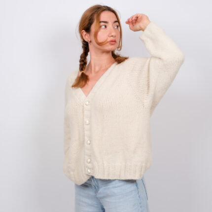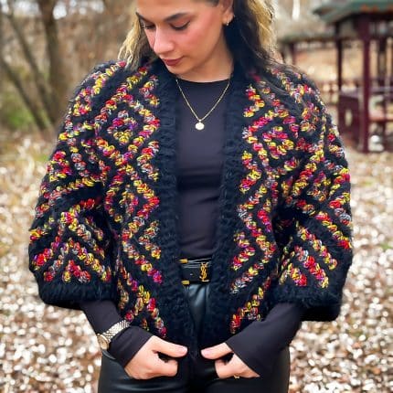 Modern tasarımın el emeğiyle buluştuğu üçgen desenli hırka, siyah ve beyazın zarif kontrastıyla tarz sahibi bir görünüm sunar. Mozaik desenli yapısı, geometrik çizgileri ve kısa kesimiyle hem günlük hem özel kombinlerde fark yaratır. Her parça, el emeğinin sıcaklığını ve özgünlüğünü taşır.
