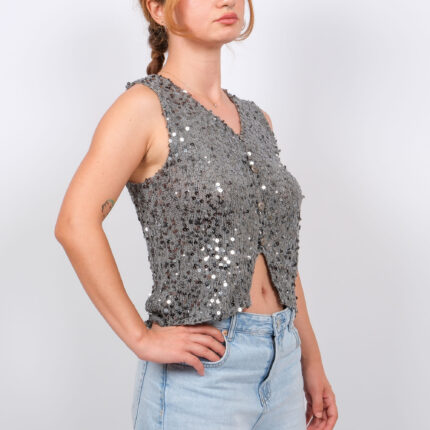 Payetli Örme Yelek – Gümüş Gri | V-Yaka | El Yapımı